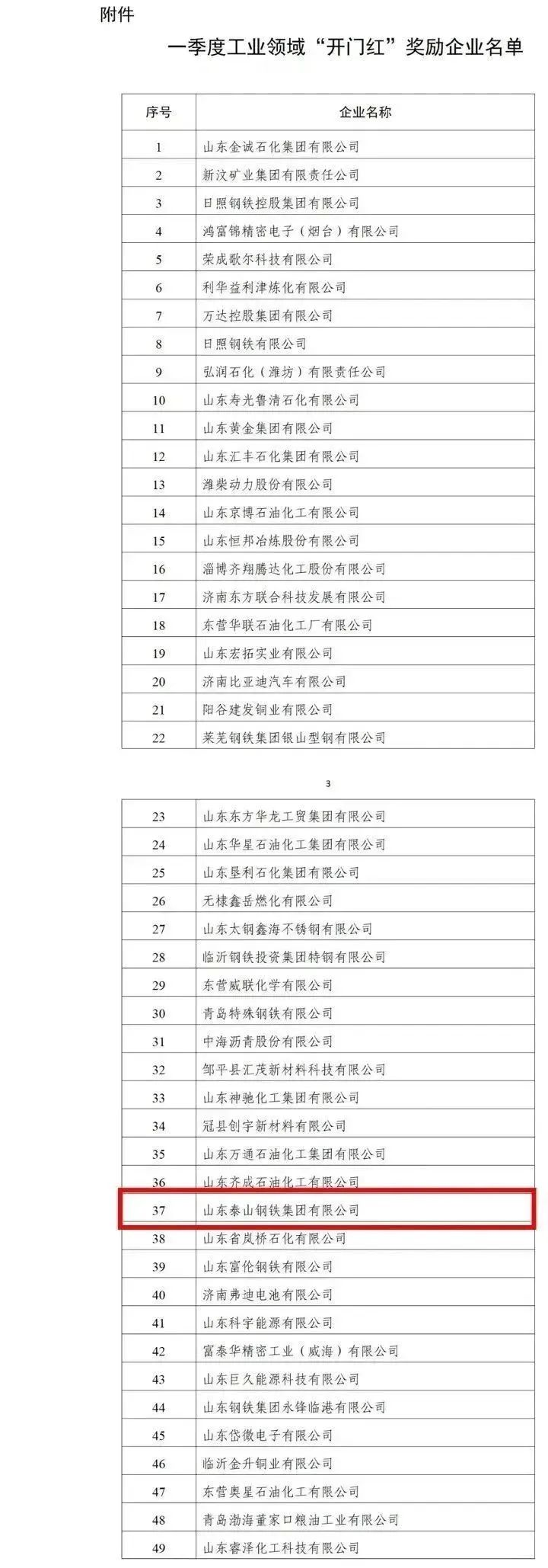 泰山钢铁集团获山东省2023年一季度工业领域“开门红”资金奖励