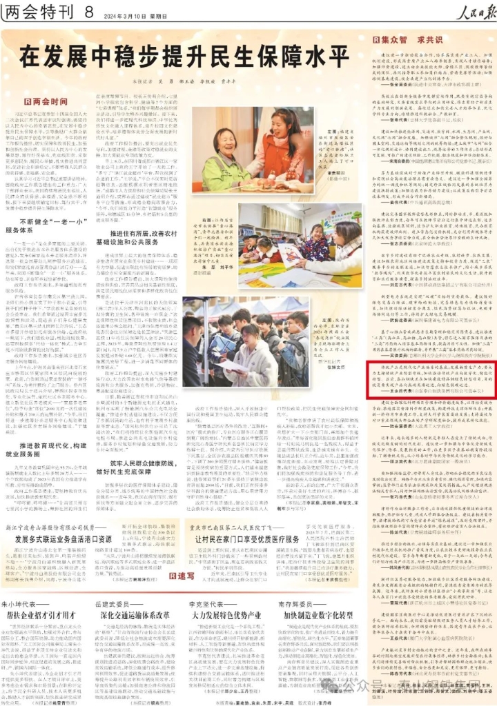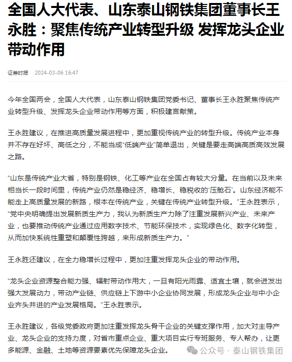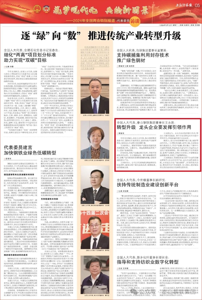 就此问题,王董事长认为,传统产业是现代化产业体系的基底,发展新质生产力除了注重发展新兴产业、未来产业,也要推动传统产业通过应用数字技术、节能环保技术,实现绿色化、数字化转型,从而加快系统性重塑和颠覆性跨越,来形成新质生产力。当前,泰山钢铁正在加快建设精品钢绿色转型项目,目的就是要实现产品向高端高质迈进,向绿色低碳迈进。