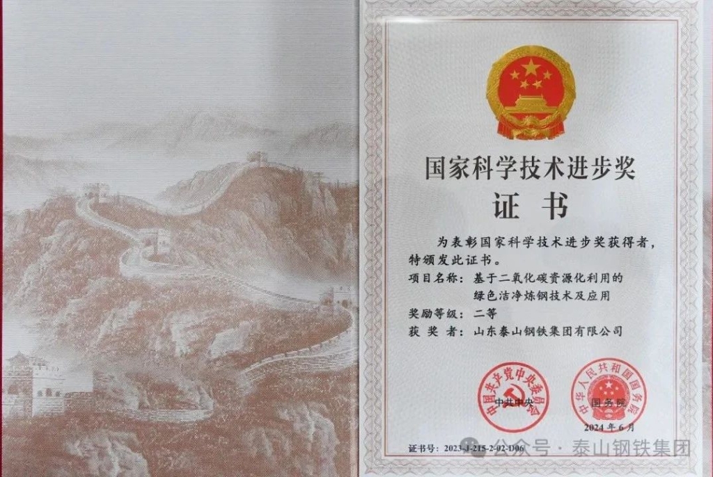 9月29日,泰山钢铁集团董事长、党委书记王永胜领受了绿色低碳钢铁冶金全国重点实验室主任、北京科技大学碳中和研究院终身教授朱荣和山东省科学技术协会副主席张波带来的“基于二氧化碳资源化利用的绿色洁净炼钢技术及应用”国家科技进步奖二等奖证书。